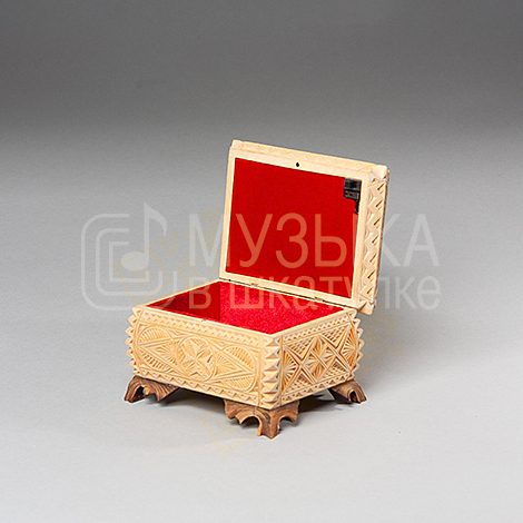 Шкатулка 12х9х8, из липы, резная, лаком не покрыта. Крышка на магните, встроенные петли. Элегантные резные ножки. Внутри шкатулка обшита красным бархатом. В крышку встроен музыкальный модуль.