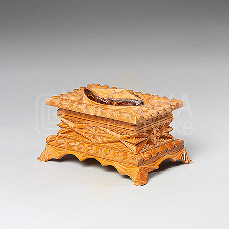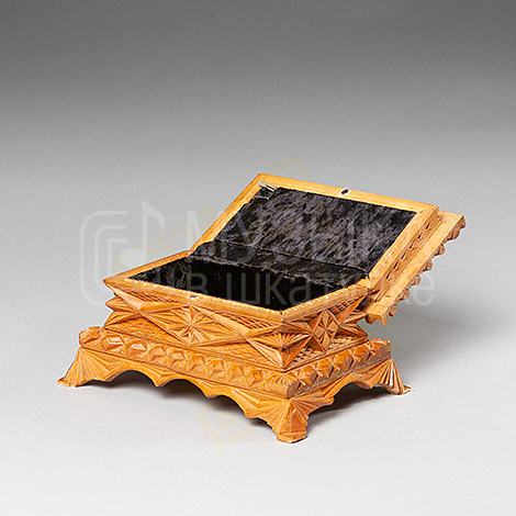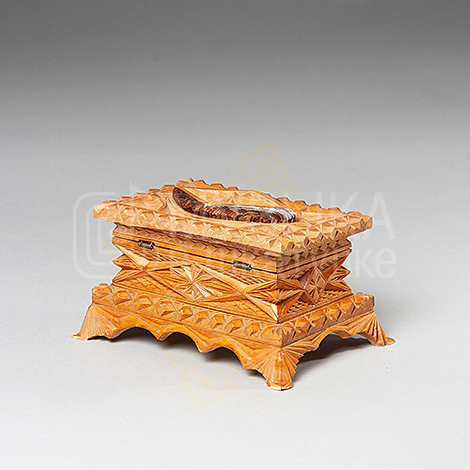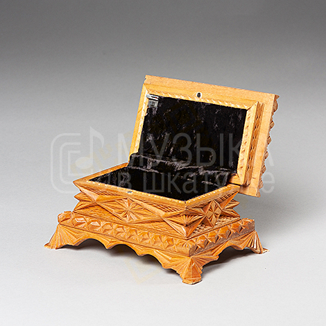 Шкатулка 19х13х10, из липы, резная, покрытая лаком. Изящные ножки, рельефная, сверху на крышке небольшая надстройка в виде резного ромба. Крышка на магните, встроенные петли. Внутри шкатулка обшита черным бархатом. В крышку встроен музыкальный модуль.
